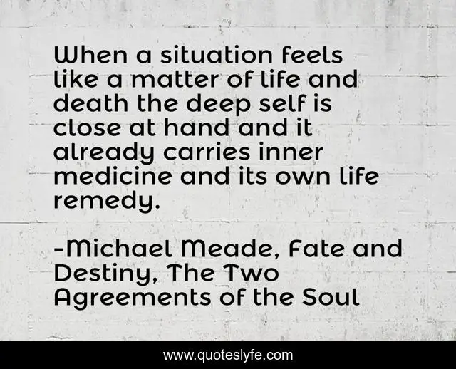 This page presents the quote "When a situation feels like a matter of life and death the deep self is close at hand and it already carries inner medicine and its own life remedy.". Author of this quote is Michael Meade, Fate and Destiny, The Two Agreements of the Soul. This quote is about deep-self, inner-strength, medicine, life-and-death,.