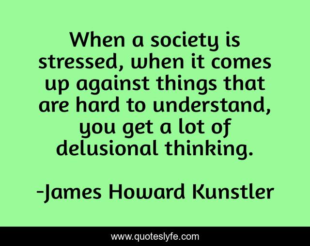 This page presents the quote "When a society is stressed, when it comes up against things that are hard to understand, you get a lot of delusional thinking.". Author of this quote is James Howard Kunstler. This quote is about thinking, stressed,.