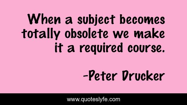 This page presents the quote "When a subject becomes totally obsolete we make it a required course.". Author of this quote is Peter Drucker. This quote is about course, required, subject,.