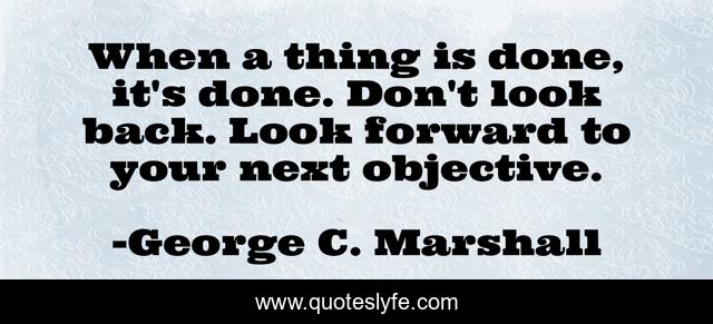 This page presents the quote "When a thing is done, it's done. Don't look back. Look forward to your next objective.". Author of this quote is George C. Marshall. This quote is about forward, done, look,.
