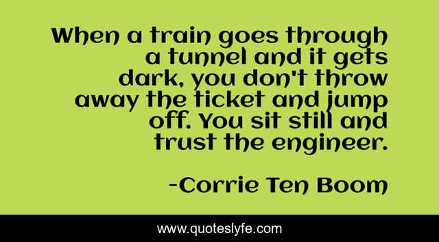 This page presents the quote "When a train goes through a tunnel and it gets dark, you don't throw away the ticket and jump off. You sit still and trust the engineer.". Author of this quote is Corrie Ten Boom. This quote is about dark, train,.