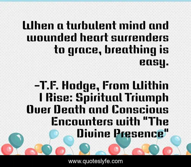 This page presents the quote "When a turbulent mind and wounded heart surrenders to grace, breathing is easy.". Author of this quote is T.F. Hodge, From Within I Rise: Spiritual Triumph Over Death and Conscious Encounters with "The Divine Presence". This quote is about breathe, heart, breathing, turbulent, peace, mind, soul, stillness, turbulence,.