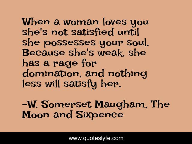 This page presents the quote "When a woman loves you she's not satisfied until she possesses your soul. Because she's weak, she has a rage for domination, and nothing less will satisfy her.". Author of this quote is W. Somerset Maugham, The Moon and Sixpence. This quote is about love, affection, women,.