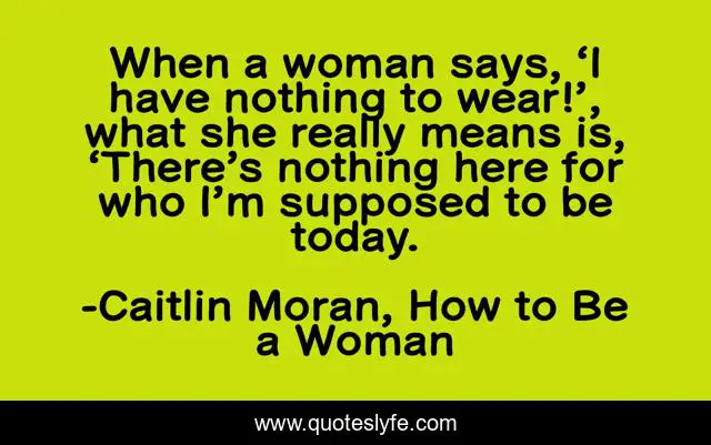 This page presents the quote "When a woman says, ‘I have nothing to wear!’, what she really means is, ‘There’s nothing here for who I’m supposed to be today.". Author of this quote is Caitlin Moran, How to Be a Woman. This quote is about clothes, women,.
