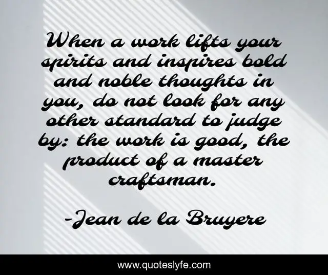 This page presents the quote "When a work lifts your spirits and inspires bold and noble thoughts in you, do not look for any other standard to judge by: the work is good, the product of a master craftsman.". Author of this quote is Jean de la Bruyere. This quote is about good, bold, thoughts,.