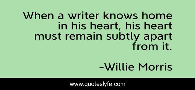 This page presents the quote "When a writer knows home in his heart, his heart must remain subtly apart from it.". Author of this quote is Willie Morris. This quote is about heart, writer,.