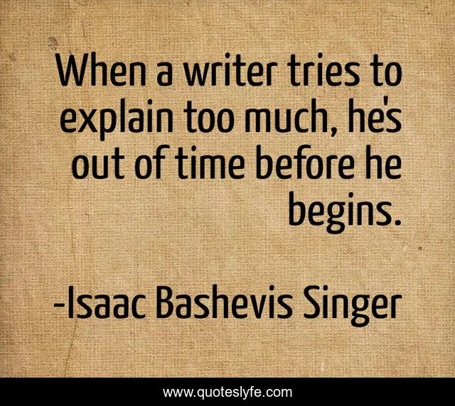 This page presents the quote "When a writer tries to explain too much, he's out of time before he begins.". Author of this quote is Isaac Bashevis Singer. This quote is about verbosity, writing,.