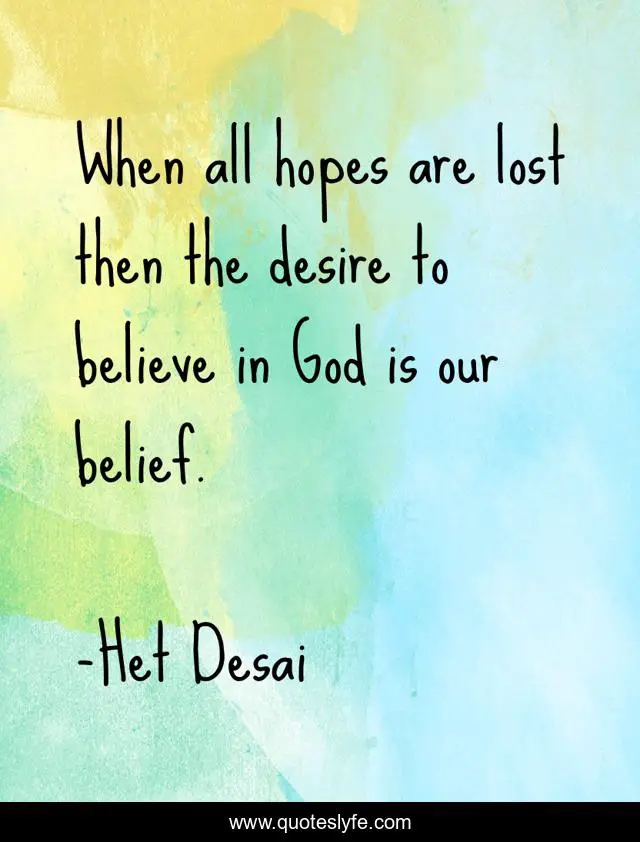 This page presents the quote "When all hopes are lost then the desire to believe in God is our belief.". Author of this quote is Het Desai. This quote is about religion, belief, hope,.
