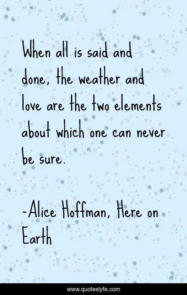 This page presents the quote "When all is said and done, the weather and love are the two elements about which one can never be sure.". Author of this quote is Alice Hoffman, Here on Earth. This quote is about weather, love, affection, uncertainty,.