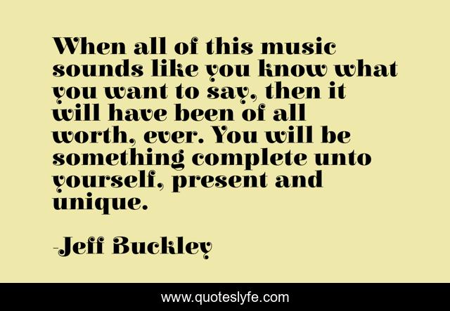 This page presents the quote "When all of this music sounds like you know what you want to say, then it will have been of all worth, ever. You will be something complete unto yourself, present and unique.". Author of this quote is Jeff Buckley. This quote is about expression, music, jeff-buckley, truth,.