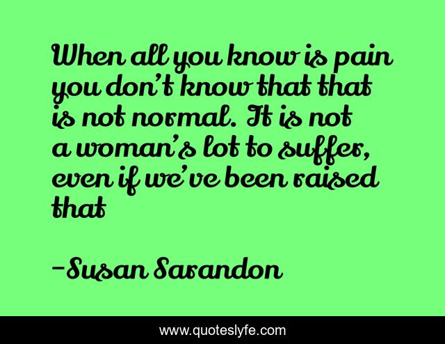 This page presents the quote "When all you know is pain you don’t know that that is not normal. It is not a woman’s lot to suffer, even if we’ve been raised that". Author of this quote is Susan Sarandon. This quote is about habituation-of-suffering, pain, womens-healthcare, habituation, suffering, womens-health, endometriosis, women,.