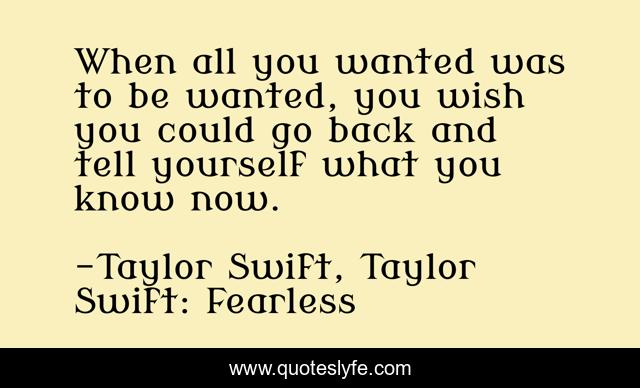 This page presents the quote "When all you wanted was to be wanted, you wish you could go back and tell yourself what you know now.". Author of this quote is Taylor Swift, Taylor Swift: Fearless. This quote is about teen, regret, taylor-swift, inspirational, song-lyrics, enthusiasm, fifteen,.