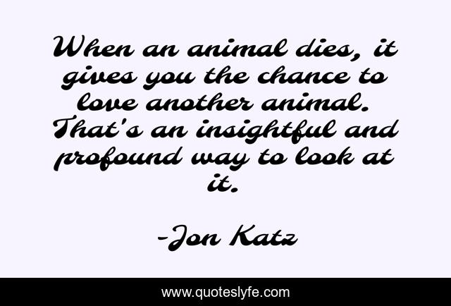 This page presents the quote "When an animal dies, it gives you the chance to love another animal. That's an insightful and profound way to look at it.". Author of this quote is Jon Katz. This quote is about love, animal, affection, profound,.