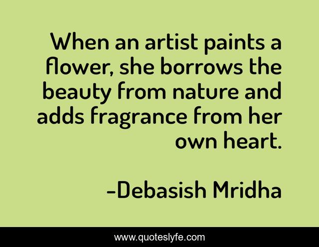 This page presents the quote "When an artist paints a flower, she borrows the beauty from nature and adds fragrance from her own heart.". Author of this quote is Debasish Mridha. This quote is about philosophy, what-is-art, artist-paints-a-flower, debasish-mridha, quotes, debasish-mridha-md, inspirational, enthusiasm, beauty-from-nature,.