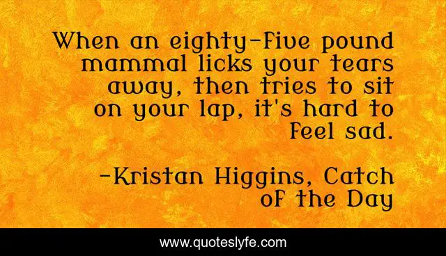 This page presents the quote "When an eighty-five pound mammal licks your tears away, then tries to sit on your lap, it's hard to feel sad.". Author of this quote is Kristan Higgins, Catch of the Day. This quote is about dogs, man-s-best-friend,.
