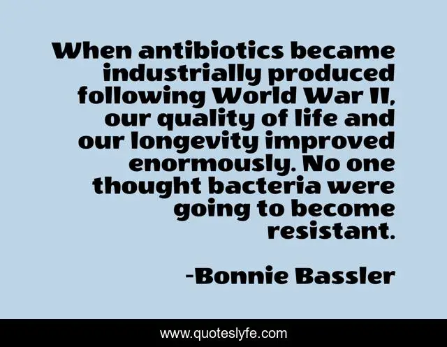 This page presents the quote "When antibiotics became industrially produced following World War II, our quality of life and our longevity improved enormously. No one thought bacteria were going to become resistant.". Author of this quote is Bonnie Bassler. This quote is about world, life, quality,.