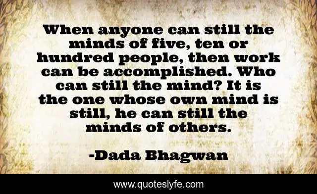 This page presents the quote "When anyone can still the minds of five, ten or hundred people, then work can be accomplished. Who can still the mind? It is the one whose own mind is still, he can still the minds of others.". Author of this quote is Dada Bhagwan. This quote is about spiritual, mind,.