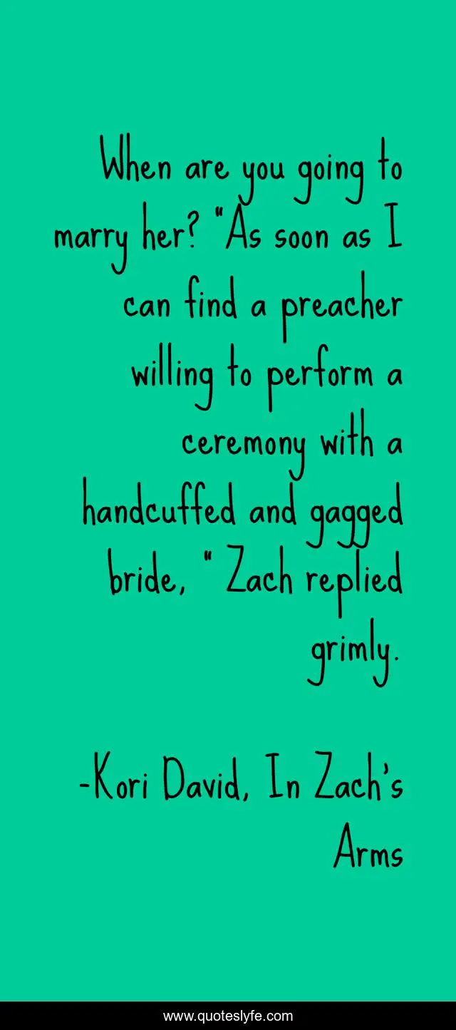 This page presents the quote "When are you going to marry her? “As soon as I can find a preacher willing to perform a ceremony with a handcuffed and gagged bride, ” Zach replied grimly.". Author of this quote is Kori David, In Zach's Arms. .