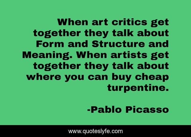 This page presents the quote "When art critics get together they talk about Form and Structure and Meaning. When artists get together they talk about where you can buy cheap turpentine.". Author of this quote is Pablo Picasso. This quote is about criticism, art,.