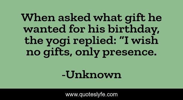 This page presents the quote "When asked what gift he wanted for his birthday, the yogi replied: “I wish no gifts, only presence.". Author of this quote is Unknown. This quote is about humour, inspiration,.