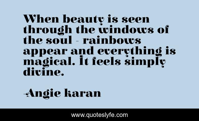 This page presents the quote "When beauty is seen through the windows of the soul - rainbows appear and everything is magical. It feels simply divine.". Author of this quote is Angie karan. This quote is about beauty, rainbows, angie-karan, magical, soul, windows-of-the-soul, divine,.