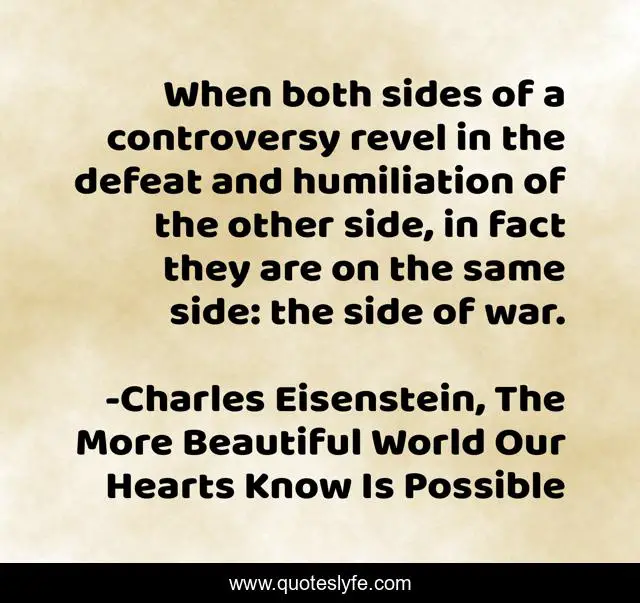 This page presents the quote "When both sides of a controversy revel in the defeat and humiliation of the other side, in fact they are on the same side: the side of war.". Author of this quote is Charles Eisenstein, The More Beautiful World Our Hearts Know Is Possible. This quote is about activism, controversy, sacred-wisdom, sacred-teachings, wisdom, humanity,.