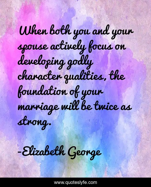 This page presents the quote "When both you and your spouse actively focus on developing godly character qualities, the foundation of your marriage will be twice as strong.". Author of this quote is Elizabeth George. This quote is about foundation, spouse, christian, faithful, author, god, character, focus, books,.