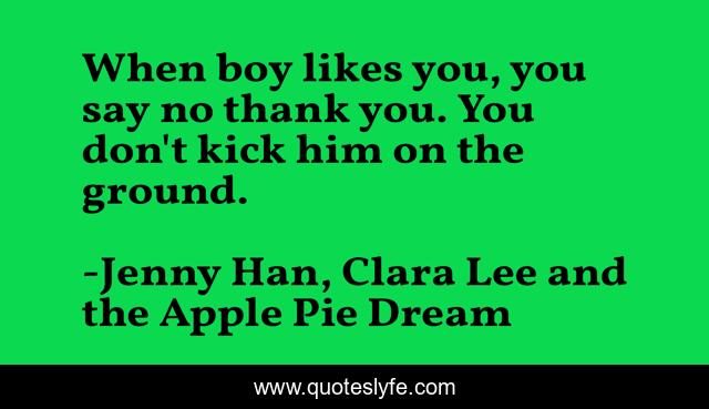 This page presents the quote "When boy likes you, you say no thank you. You don't kick him on the ground.". Author of this quote is Jenny Han, Clara Lee and the Apple Pie Dream. This quote is about humor, truth,.