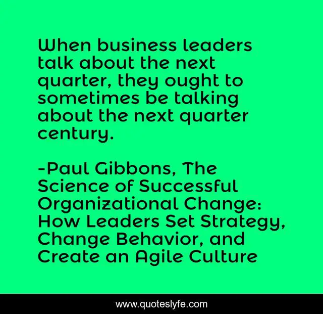 This page presents the quote "When business leaders talk about the next quarter, they ought to sometimes be talking about the next quarter century.". Author of this quote is Paul Gibbons, The Science of Successful Organizational Change: How Leaders Set Strategy, Change Behavior, and Create an Agile Culture. This quote is about change-the-world, leadership, change-management, vision, leadership-development,.