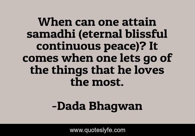 This page presents the quote "When can one attain samadhi (eternal blissful continuous peace)? It comes when one lets go of the things that he loves the most.". Author of this quote is Dada Bhagwan. This quote is about eternal-bliss, spiritual, love, peace, let-go, bliss, affection,.