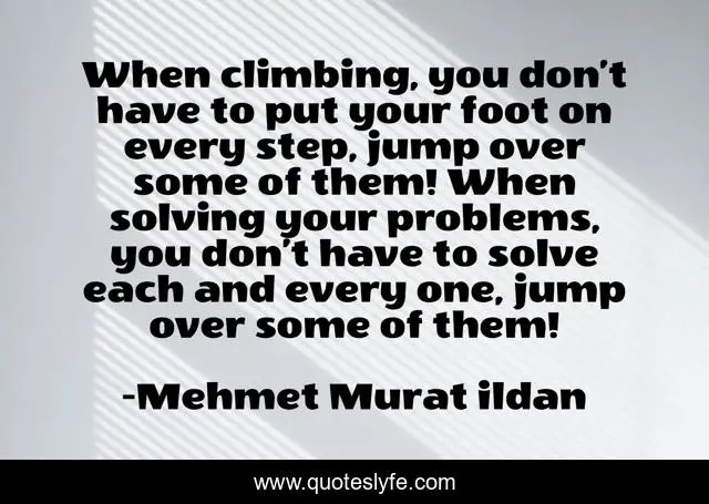 This page presents the quote "When climbing, you don’t have to put your foot on every step, jump over some of them! When solving your problems, you don’t have to solve each and every one, jump over some of them!". Author of this quote is Mehmet Murat ildan. .