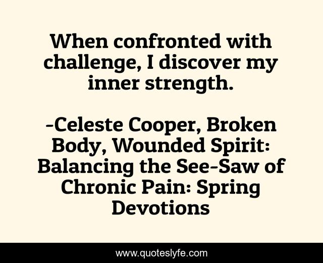 This page presents the quote "When confronted with challenge, I discover my inner strength.". Author of this quote is Celeste Cooper, Broken Body, Wounded Spirit: Balancing the See-Saw of Chronic Pain: Spring Devotions. This quote is about coping, health, pain, self-help-book, inspiration,.