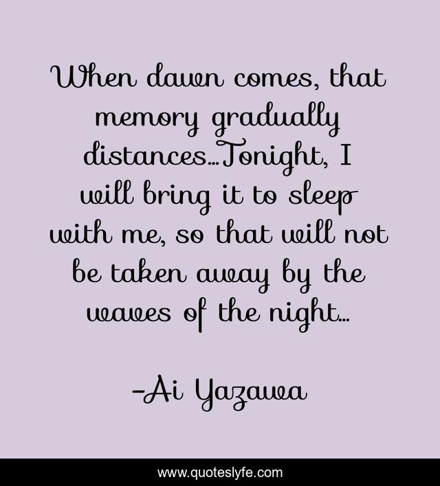 This page presents the quote "When dawn comes, that memory gradually distances...Tonight, I will bring it to sleep with me, so that will not be taken away by the waves of the night...". Author of this quote is Ai Yazawa. This quote is about nana, night,.