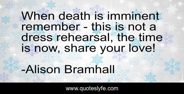 This page presents the quote "When death is imminent remember - this is not a dress rehearsal, the time is now, share your love!". Author of this quote is Alison Bramhall. This quote is about inspirational-about-life, share-your-love,.