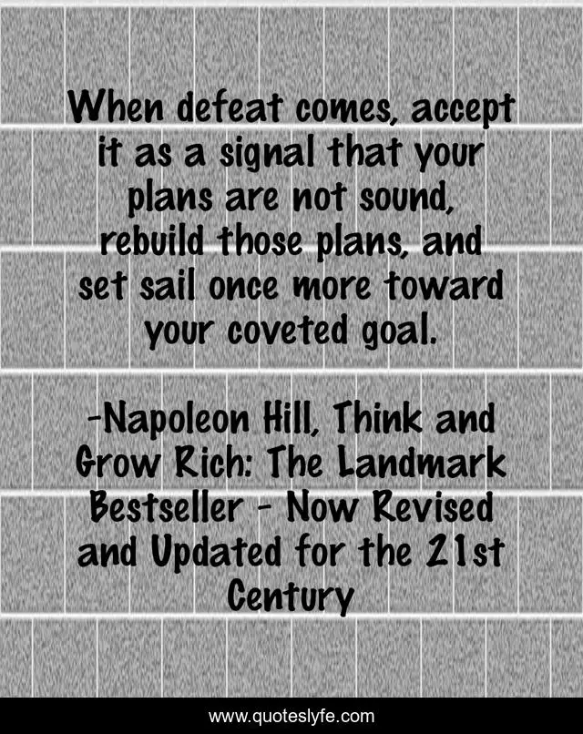 This page presents the quote "When defeat comes, accept it as a signal that your plans are not sound, rebuild those plans, and set sail once more toward your coveted goal.". Author of this quote is Napoleon Hill, Think and Grow Rich: The Landmark Bestseller - Now Revised and Updated for the 21st Century. This quote is about life, goal, career, money, defeat, motivation, goals, inspirational, self-help,.