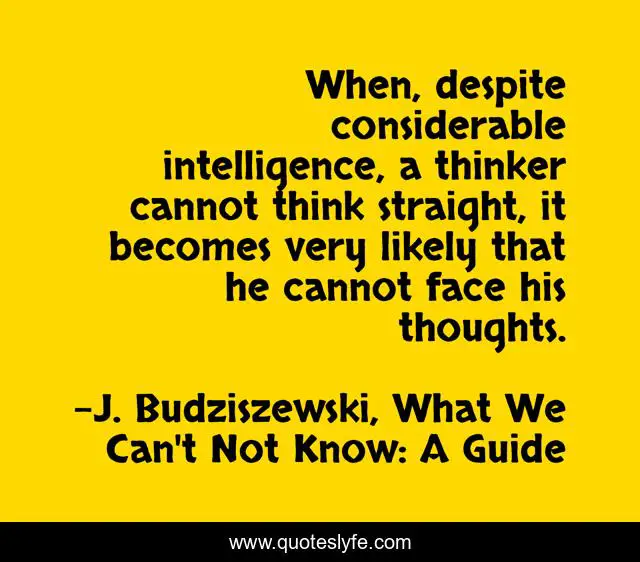 This page presents the quote "When, despite considerable intelligence, a thinker cannot think straight, it becomes very likely that he cannot face his thoughts.". Author of this quote is J. Budziszewski, What We Can't Not Know: A Guide. This quote is about thinkers, thinking, intelligence, thinker, thoughts, morality,.