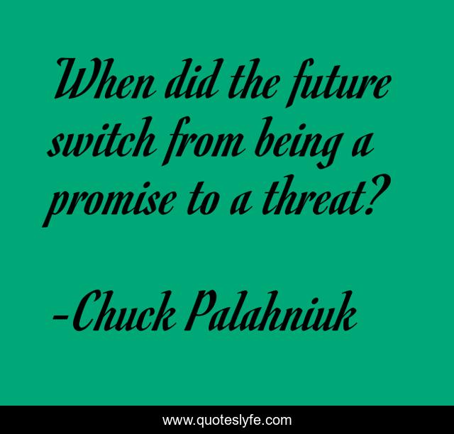 This page presents the quote "When did the future switch from being a promise to a threat?". Author of this quote is Chuck Palahniuk. This quote is about being, promise,.