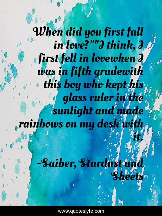 This page presents the quote "When did you first fall in love?""I think, I first fell in lovewhen I was in fifth gradewith this boy who kept his glass ruler in the sunlight and made rainbows on my desk with it.". Author of this quote is Saiber, Stardust and Sheets. This quote is about cute, fifth-grade, first-crush, humor, saiber, relationship, memories, innocence, first-love,.