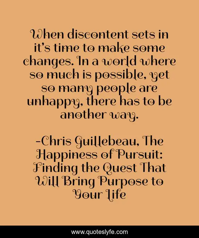"Chris Guillebeau, The Happiness of Pursuit: Finding the Quest That Will Bring Purpose to Your Life Quotes." Quoteslyfe.com, 2025. Fri. 05 Dec. 2025. <https://www.quoteslyfe.com/quote/When-discontent-sets-in-it-s-time-59868>.