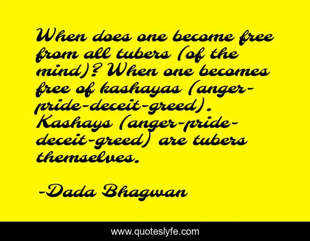 This page presents the quote "When does one become free from all tubers (of the mind)? When one becomes free of kashayas (anger-pride-deceit-greed). Kashays (anger-pride-deceit-greed) are tubers themselves.". Author of this quote is Dada Bhagwan. This quote is about spiritual, kashay, mind, tubers-of-the-mind, anger, deceit, pride, greed,.