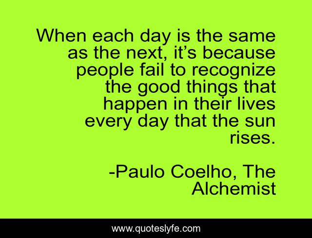 This page presents the quote "When each day is the same as the next, it’s because people fail to recognize the good things that happen in their lives every day that the sun rises.". Author of this quote is Paulo Coelho, The Alchemist. This quote is about enthusiasm, inspirational,.