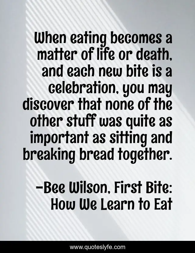 This page presents the quote "When eating becomes a matter of life or death, and each new bite is a celebration, you may discover that none of the other stuff was quite as important as sitting and breaking bread together.". Author of this quote is Bee Wilson, First Bite: How We Learn to Eat. .