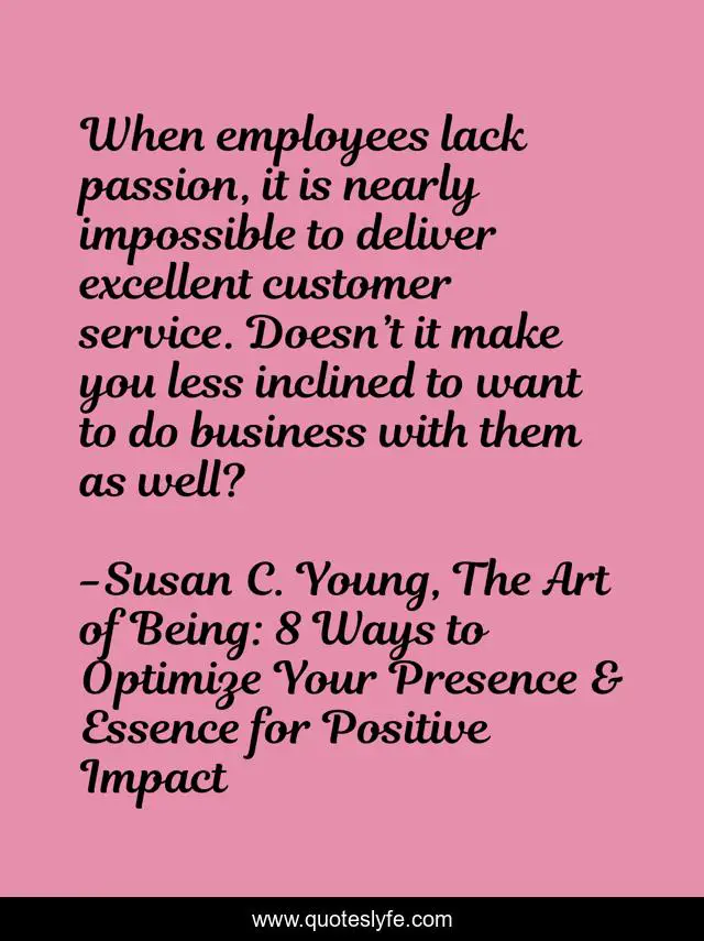 This page presents the quote "When employees lack passion, it is nearly impossible to deliver excellent customer service. Doesn’t it make you less inclined to want to do business with them as well?". Author of this quote is Susan C. Young, The Art of Being: 8 Ways to Optimize Your Presence & Essence for Positive Impact. This quote is about confidence, susan-young, relationship, communication-skills, passionate-living, communication, first-impressions, authenticity, integrity,.