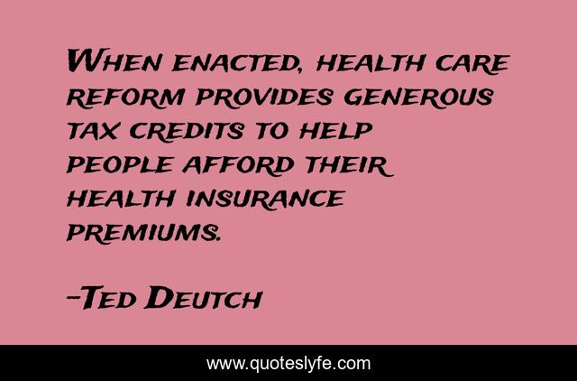 This page presents the quote "When enacted, health care reform provides generous tax credits to help people afford their health insurance premiums.". Author of this quote is Ted Deutch. This quote is about people, insurance, help,.