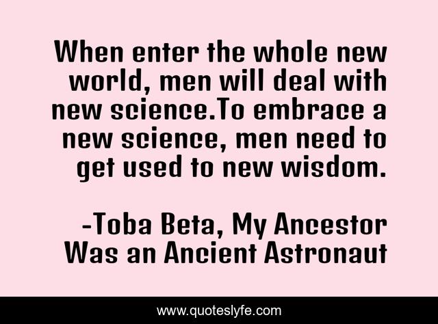 This page presents the quote "When enter the whole new world, men will deal with new science.To embrace a new science, men need to get used to new wisdom.". Author of this quote is Toba Beta, My Ancestor Was an Ancient Astronaut. This quote is about science, new, mind, idea, world,.