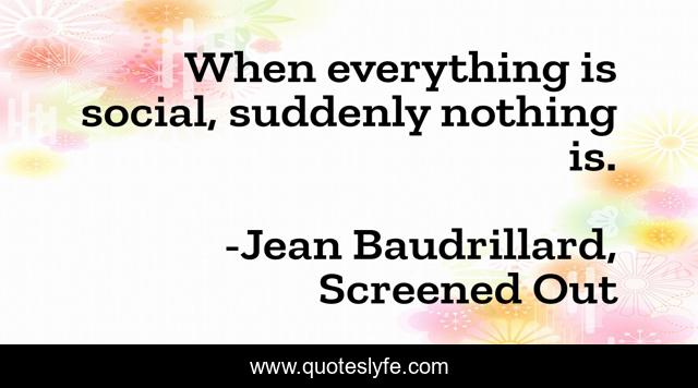 "Jean Baudrillard, Screened Out Quotes." Quoteslyfe.com, 2025. Mon. 08 Dec. 2025. <https://www.quoteslyfe.com/quote/When-everything-is-social-suddenly-nothing-is-219922>.