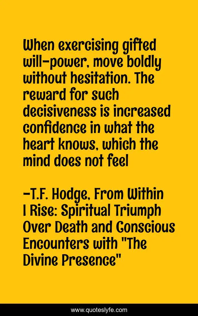 This page presents the quote "When exercising gifted will-power, move boldly without hesitation. The reward for such decisiveness is increased confidence in what the heart knows, which the mind does not feel". Author of this quote is T.F. Hodge, From Within I Rise: Spiritual Triumph Over Death and Conscious Encounters with "The Divine Presence". This quote is about faith, confidence, decisiveness, force, bold, will-power, heart, mental-toughness, mentality,.