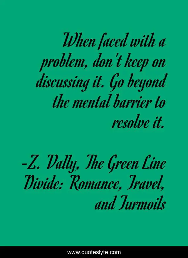 This page presents the quote "When faced with a problem, don't keep on discussing it. Go beyond the mental barrier to resolve it.". Author of this quote is Z. Vally, The Green Line Divide: Romance, Travel, and Turmoils. This quote is about helping, enthusiasm, food-for-thought, action-over-thought, inspirational,.