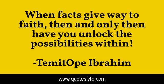This page presents the quote "When facts give way to faith, then and only then have you unlock the possibilities within!". Author of this quote is TemitOpe Ibrahim. This quote is about give-way, believe, universal-truths, possibilities, give, universal-truth, inspirational, possibility, access,.