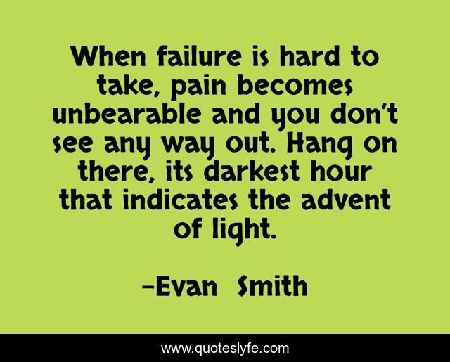 This page presents the quote "When failure is hard to take, pain becomes unbearable and you don’t see any way out. Hang on there, its darkest hour that indicates the advent of light.". Author of this quote is Evan Smith. This quote is about perseverance, confidence, positive, motivational, determination, optimistic, inspirational, enthusiasm, hope,.